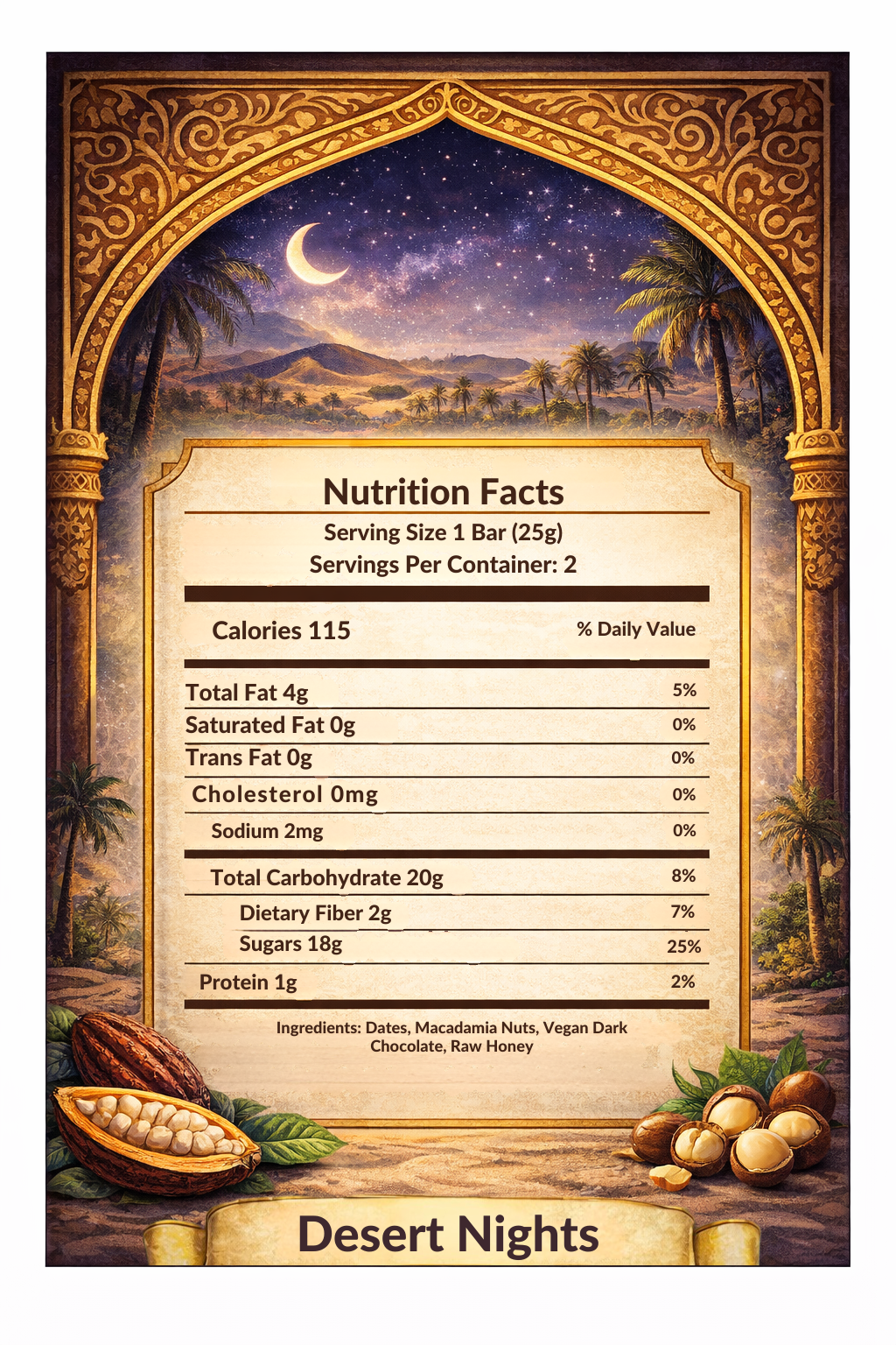 Desert Nights is a deeper, more indulgent energy profile made with dates, macadamia nuts, chocolate, and honey — designed for long-lasting endurance fuel and steady output over time.